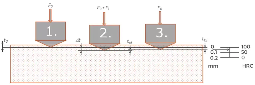 - In the third step, the load is relieved again up to the preload F0. The indenter moves back upwards by the elastic portion of the deformation tel so that the remaining indentation depth is tbl. The hardness value is either displayed directly on the hardness tester or can be calculated from the measured indentation depth.