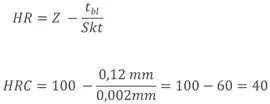 In the HRC method, Z is 100 and the scale division Skt is 0.002 mm. If a permanent indentation depth of 0.12 mm is measured, the Rockwell C hardness is 40 HRC.