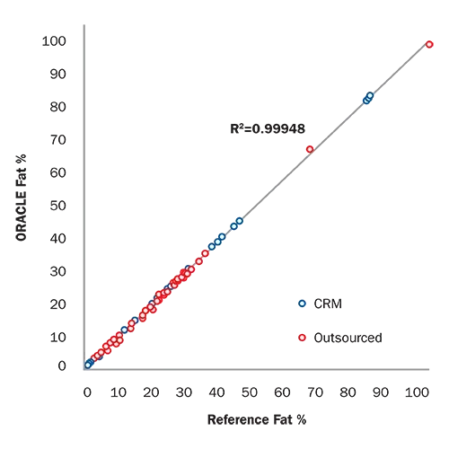 ORACLE was verified with over 30 Certified Reference Materials (CRM’s) sourced from Europe and USA. These trusted samples undergo extensive reference testing in numerous certified laboratories and provide a benchmark for any food testing methodology. The blue data in the graph shows the linearity between the CRM reference results and the ORACLE rapid fat results. Since CRM’s are limited in their available matrices, CEM also outsourced hundreds of samples to third party testing laboratories for wet chemical reference chemistry analysis. The red data in the chart shows the comparison between the outside lab reference results and ORACLE.