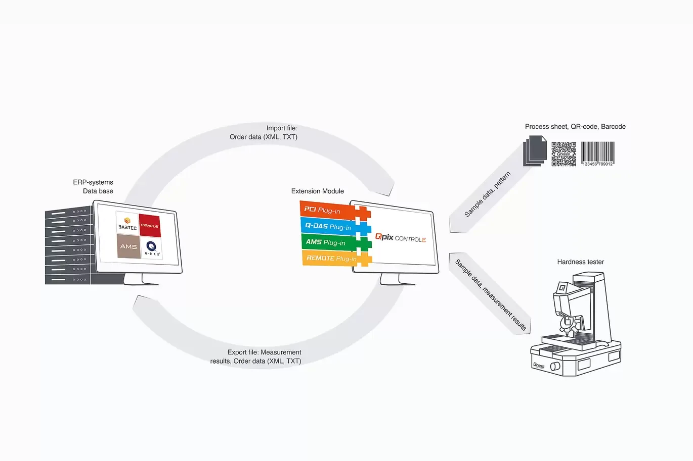 Qconnect is the interface in QATM Qpix Control2 software, providing customers with a full portfolio of inter-device connectivity - from serial production, open XML interfaces (bi-directional) and pre-specified plug-in solutions, such as the QDAS Plug-In+, through to customer-specific connectivity solutions implemented completely by QATM. We have a professional solution for every applicational requirement.