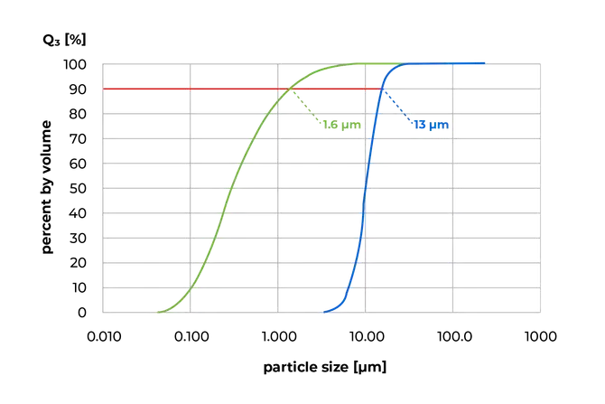 Для отримання дуже дрібних частинок розміром 100 нм або менше (нанорозмірне подрібнення) шляхом мокрого подрібнення потрібне тертя, а не удар. Це досягається за рахунок використання великої кількості дрібних помольних куль, які мають велику поверхню і багато точок тертя. Ідеальний рівень заповнення стакану повинен на 60 % складатися з дрібних помольних куль.На графіку показано результат подрібнення скла за швидкості 360 об/хв у млині PM 400. Після 1 год подрібнення в етанолі в комплекті з 1 мм помольними кулями значення D90 вихідного зразка зменшилося з 13 мкм до 1,6 мкм.