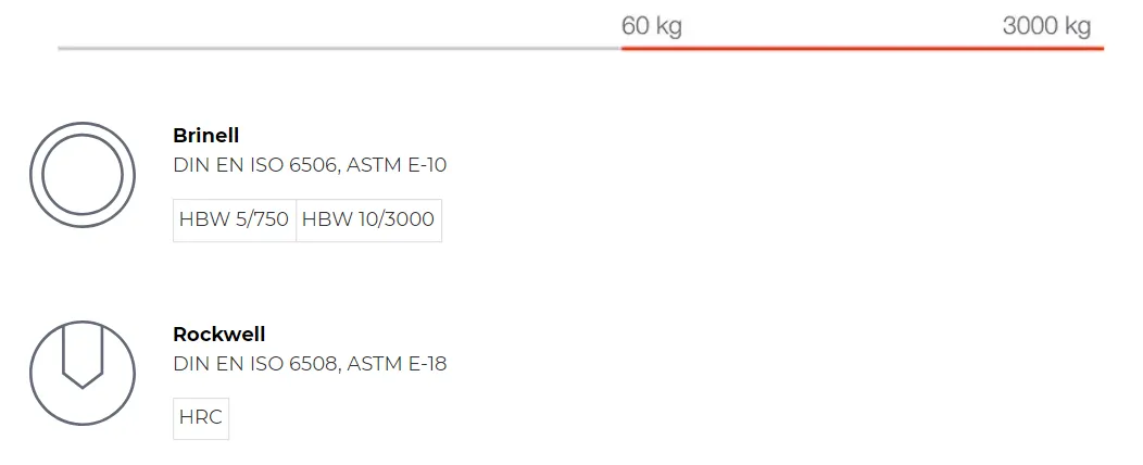 - Стандартизовані вимірювання за методами Брінелля і Роквелла згідно з EN ISO і ASTM