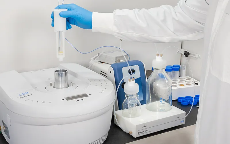 Discover SPPS - це ручний синтезатор пептидів, який використовує мікрохвилі для забезпечення більш високої швидкості і чистоти, ніж традиційний ручний SPPS. Discover SPPS дозволяє аналізувати реакційну суміш між етапами для оптимізації методу або навчання. Повна депротекція, з'єднання і розщеплення за допомогою мікрохвильових методів займає 3 хвилини, 5 хвилин і 30 хвилин відповідно.