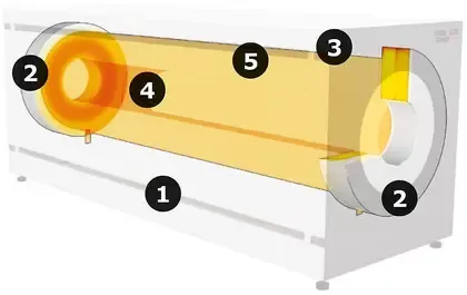 Внутрішній кожух прямокутної форми з отворами для конвекції забезпечує охолодження зовнішнього кожуха. Торцева ізоляція з керамічного волокна з низькою питомою теплоємністю дає змогу звести тепловтрати, спричинені теплопровідністю, до мінімуму. Усередині печі розташовані відкриті нагрівальні елементи з вакуумформованого волокна, які кріпляться до теплоізоляції в керамічних тримачах. Також у печах F можуть використовуватися дротяні нагрівальні елементи товщиною 5 мм. Джерело живлення з важким силовим трансформатором низької напруги забезпечує високу стабільність температури і тривалий термін служби нагрівальних елементів порівняно з традиційними способами нагріву. Для вимірювання температури в печі використовується термопара високого класу типу S. Ця піч може мати до 8 зон нагріву для забезпечення ефективного регулювання і високої однорідності температури.