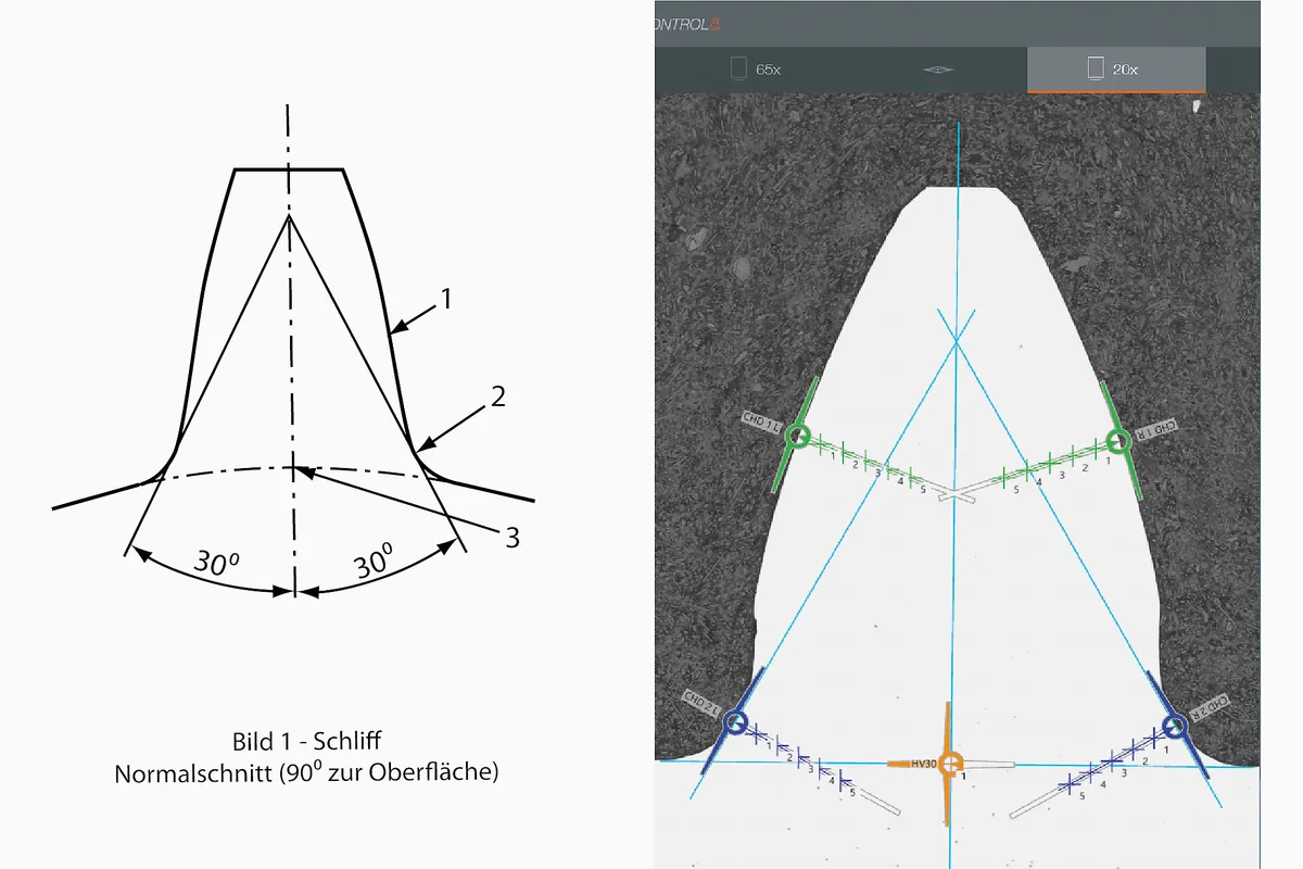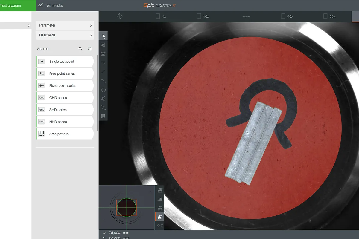Можливість послідовності вимірювань за допомогою модуля "Функції для контролю зварювання" забезпечує просту інтеграцію карт контрольних точок для вимірювання твердості за Віккерсом / Кнупом / Брінелем, що відповідає нормам (наприклад, EN ISO 9015 і EN ISO 22826). Попередньо створені шаблони можуть бути легко адаптовані до кожного відповідного випробувального зразка за допомогою інтерактивних функцій. За необхідності модулі Qpix INSPECT також можуть забезпечити одночасний графічний аналіз матеріалів зварного шва.