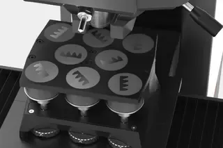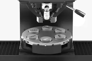 Тримачі зразків QATM, що містять до восьми вбудованих зразків, можуть бути розміщені на опорі для великих зразків для проведення випробувань за одну операцію.