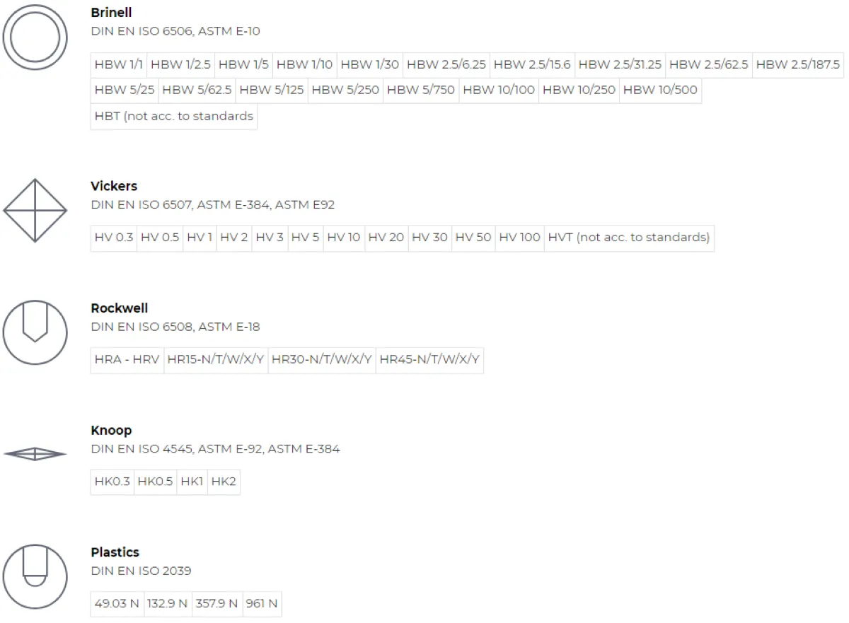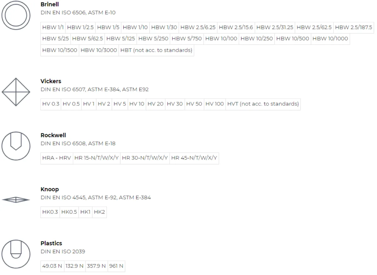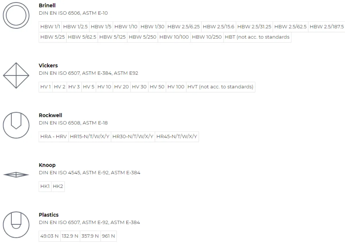 | Підтримувані методи випробовувань | Брінелль, Віккерс, Роквелл, Кнуп, твердість пластику |