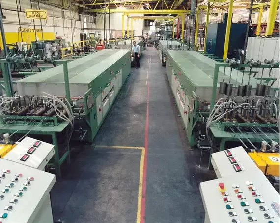 Непрерывные 6-ти полосные горизонтальные печи для закалки и отпуска в атмосфере крекинг-аммиака. Шесть зон нагрева в установке закалки и 9 зон в установке отпуска (3 обогреваемых секции по 3 зоны)